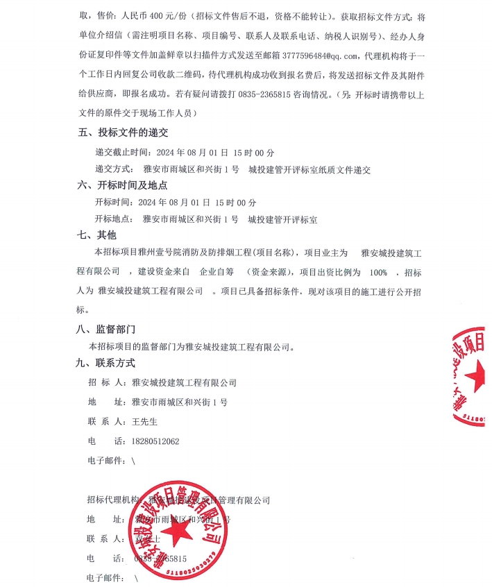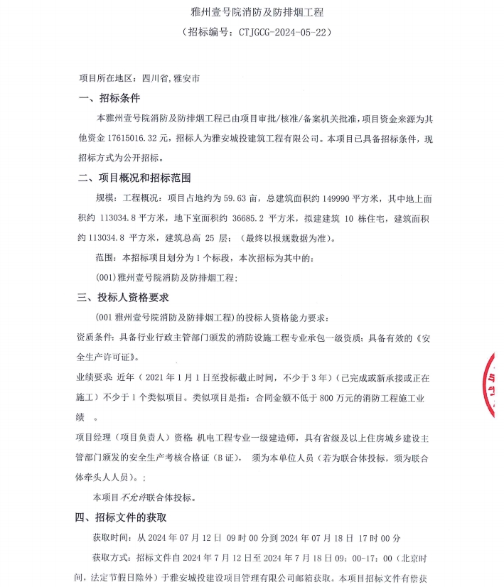 雅州壹號(hào)院項(xiàng)目消防及防排煙通風(fēng)工程公告