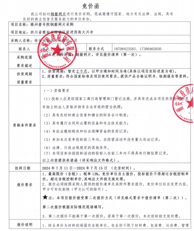 附件1:競價(jià)函--雅州壹號院鋼筋網(wǎng)片采購