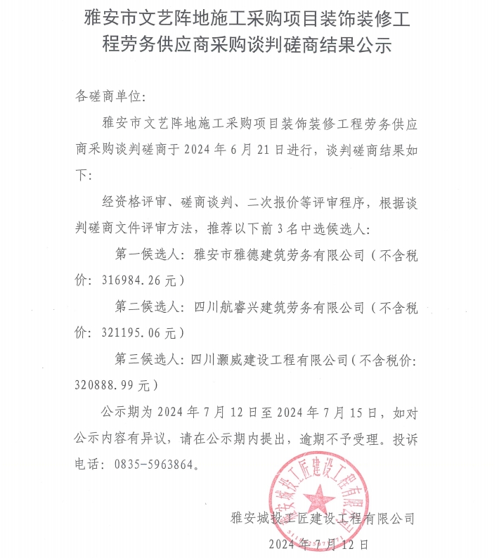 雅安市文藝陣地施工采購(gòu)項(xiàng)目裝飾裝修工程勞務(wù)供應(yīng)商采購(gòu)談判磋商結(jié)果公示