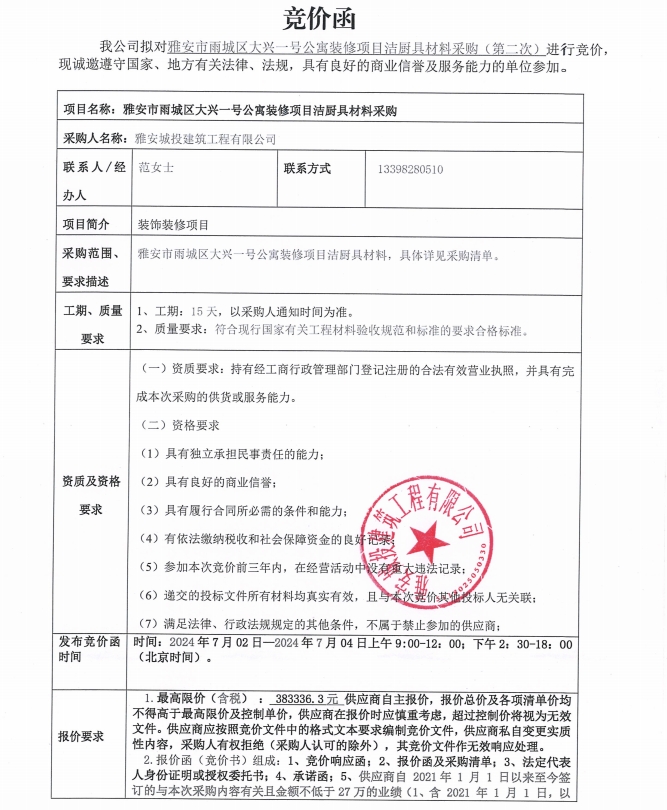 雅安市雨城區(qū)大興一號公寓裝修項(xiàng)目潔廚具材料采購(第二次)競價公告