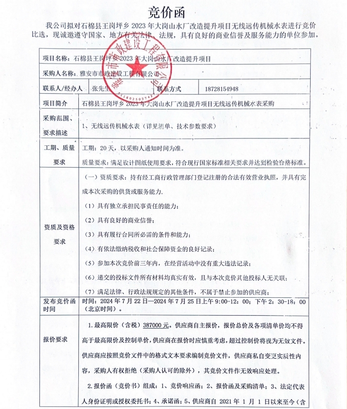 2023年大崗山水廠改造提升項(xiàng)目無線遠(yuǎn)傳機(jī)械水表競價函