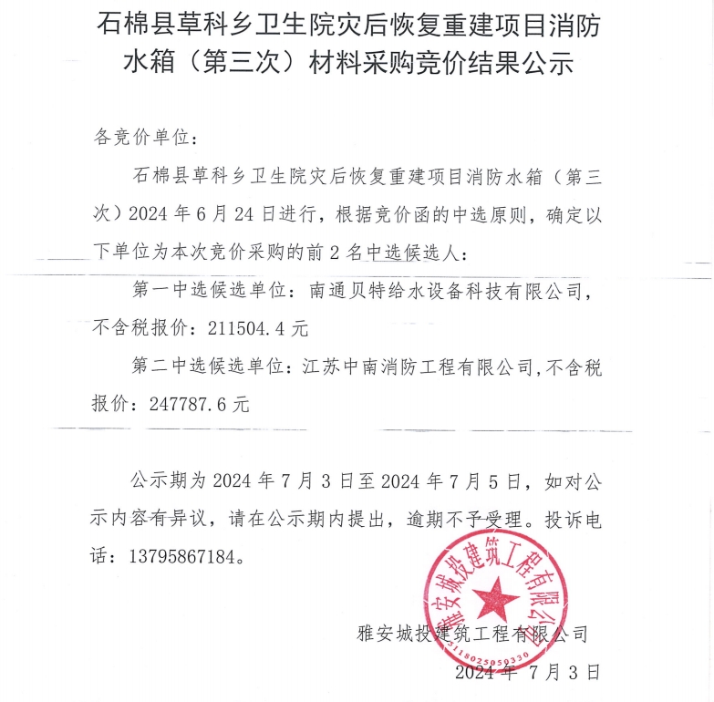 石棉縣草科鄉(xiāng)衛(wèi)生院災(zāi)后恢復(fù)重建項目消防水箱(第三次)材料采購競價結(jié)果公示