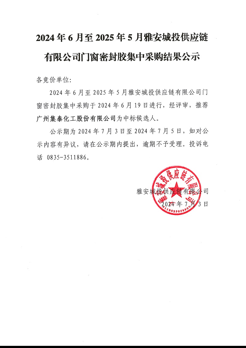 2024年6月至2025年5月雅安城投供應(yīng)鏈有限公司門窗密封膠集中采購結(jié)果公示