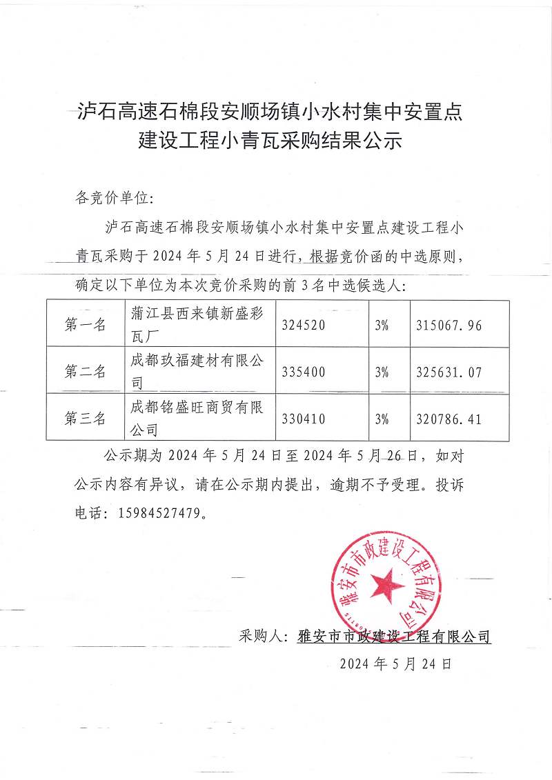瀘石高速石棉縣段安順場(chǎng)鎮(zhèn)小水村集中安置點(diǎn)建設(shè)工程小青瓦采購結(jié)果公示