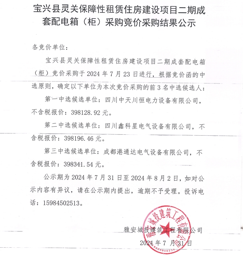 寶興縣靈關(guān)保障性租賃住房建設(shè)項(xiàng)目二期成套配電箱(柜)采購(gòu)競(jìng)價(jià)采購(gòu)結(jié)果過(guò)公示