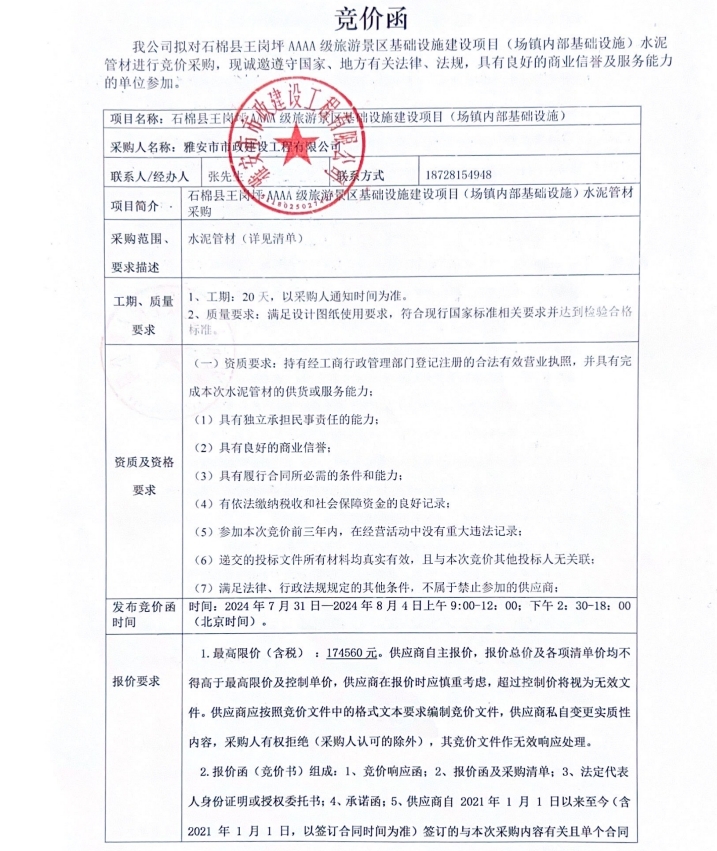 石棉縣王崗坪AAAA級旅游景區(qū)基礎(chǔ)設(shè)施建設(shè)項目(場鎮(zhèn)內(nèi)部基礎(chǔ)設(shè)施)水泥管材采購競價公告