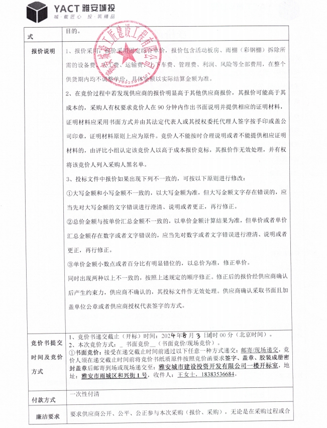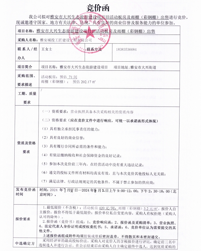 附件2:雅安市大興生態(tài)旅游建設項目舊活動板房出售競價函