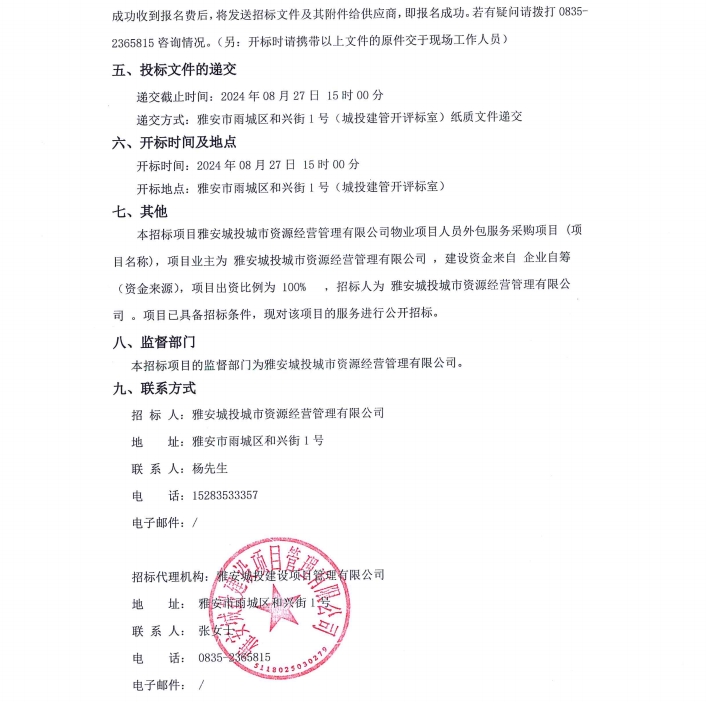 雅安城投城市資源經(jīng)營管理有限公司物業(yè)項目人員外包服務(wù)采購項目(項目名稱)服務(wù)/標(biāo)段公告