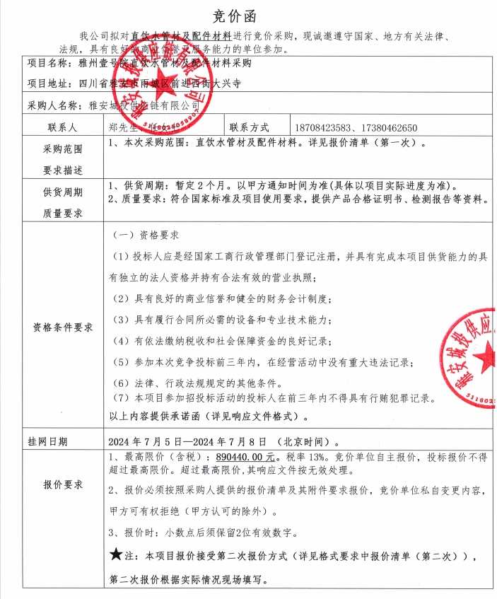 附件1:競價(jià)函--雅州壹號院直飲水管材及配件材料采購