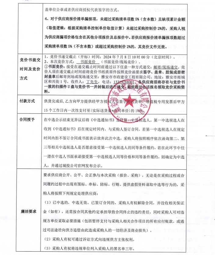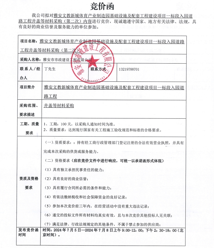 雅安文教新城體育產(chǎn)業(yè)制造園基礎(chǔ)設(shè)施及配套工程建設(shè)項(xiàng)目一標(biāo)段入園道路工程井蓋等材料采購(gòu)(第二次)競(jìng)價(jià)公告