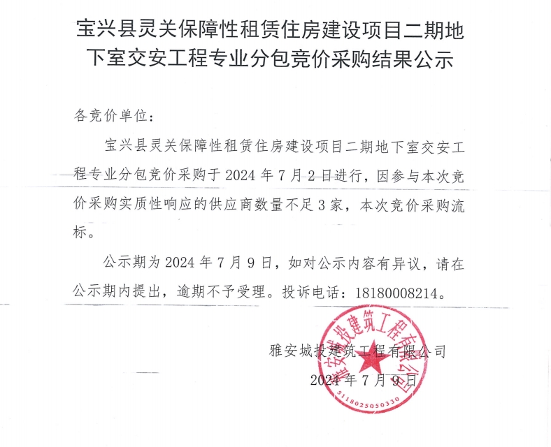 寶興縣靈關(guān)保障性租賃住房建設(shè)項目二期地下室交安工程專業(yè)分包競價采購結(jié)果公示