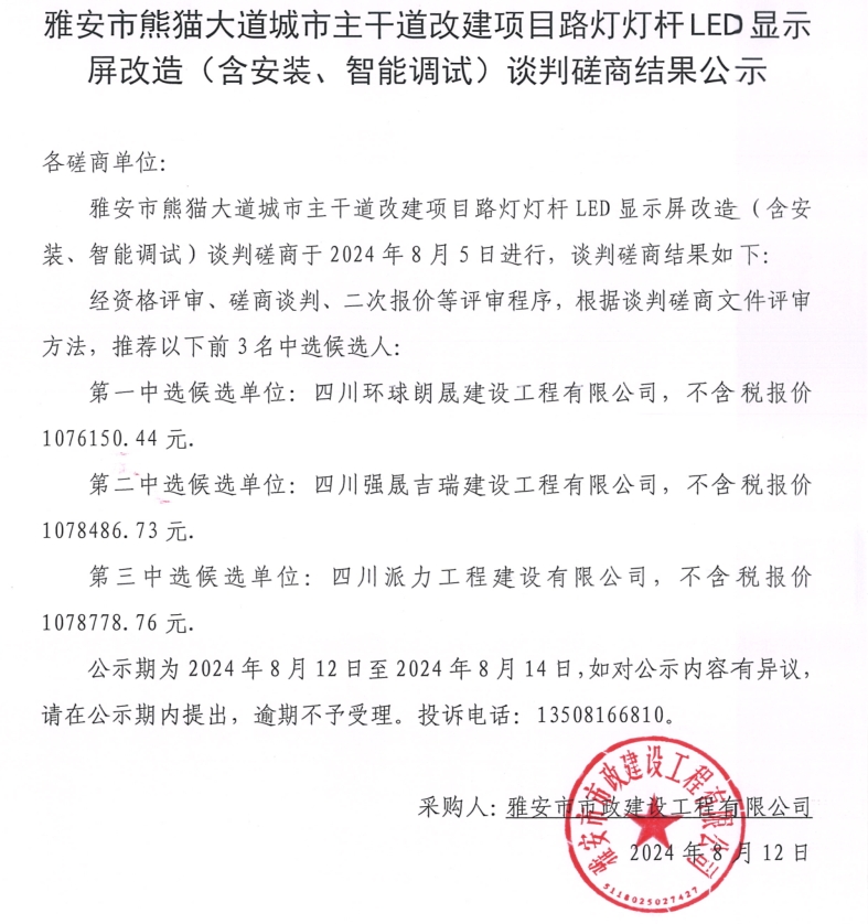 雅安市熊貓大道城市主干道改建項(xiàng)目路燈燈桿LED顯示屏(含安裝、智能化調(diào)試)談判磋商結(jié)果公示