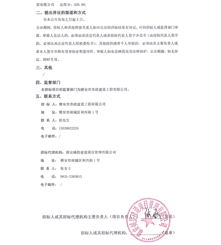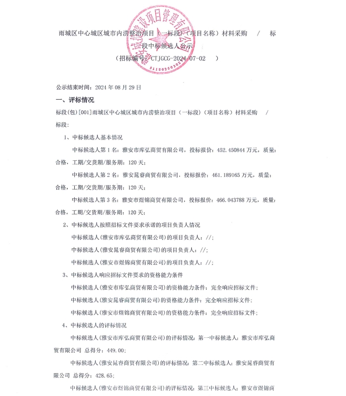 雨城區(qū)中心城區(qū)城市內(nèi)澇整治項(xiàng)目(一標(biāo)段)(項(xiàng)目名稱)材料采購(gòu)/標(biāo)段中標(biāo)候選人公示