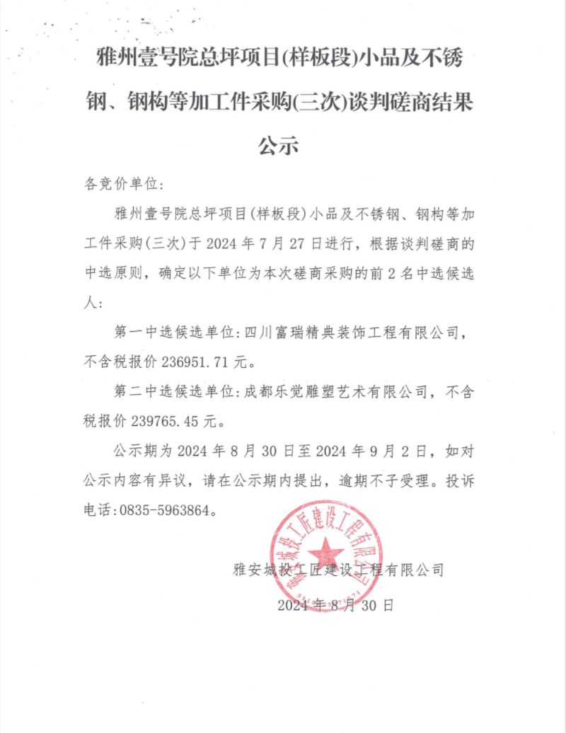 雅州壹號院總坪項(xiàng)目(樣板段)小品及不銹鋼、鋼構(gòu)等加工件采購(三次)談判磋商結(jié)果公示