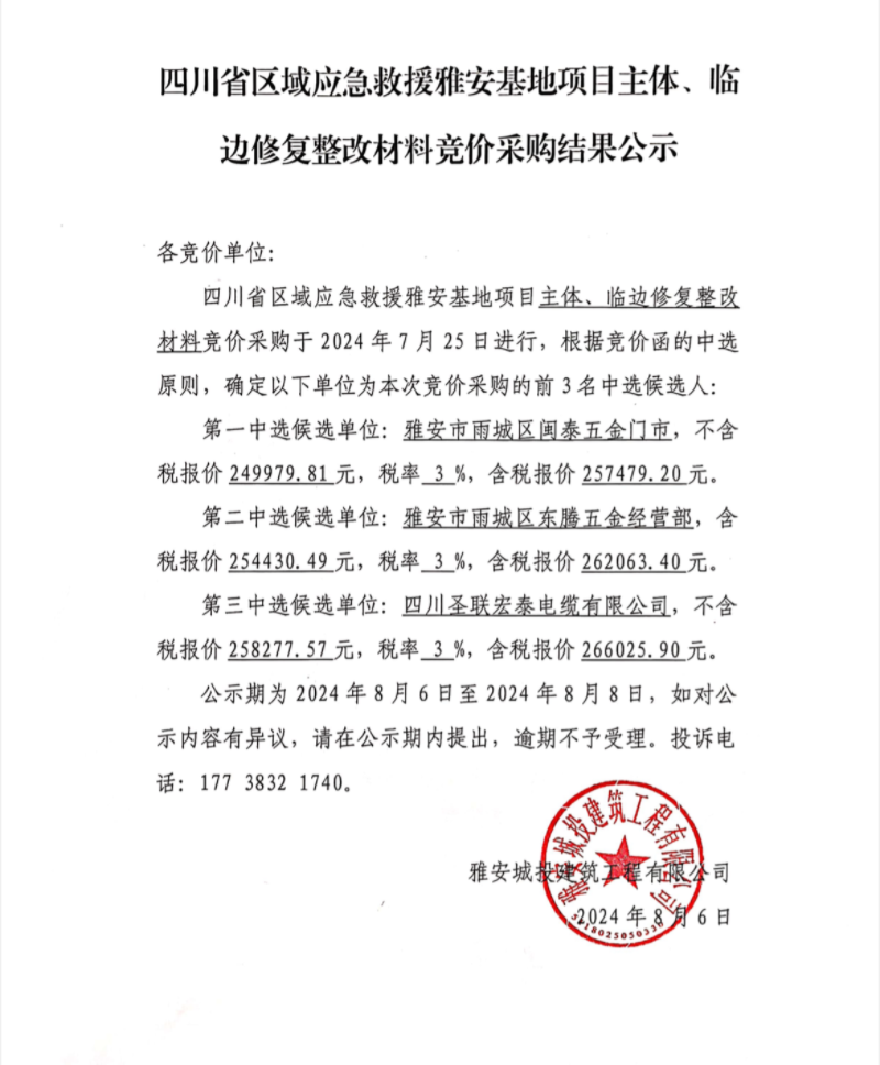 四川省區(qū)域應急救援雅安基地項目主體、臨邊修復整改材料競價采購結果公示