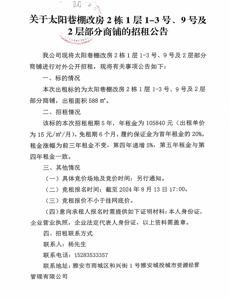 關(guān)于太陽巷棚改房2棟1層1-3號、9號及2層部分商鋪的招租公告
