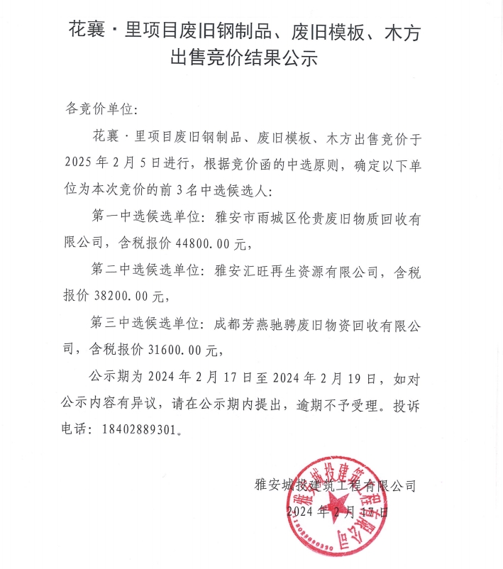 花襄·里項目廢舊鋼制品、廢舊模版、木方出售競價結(jié)果公示