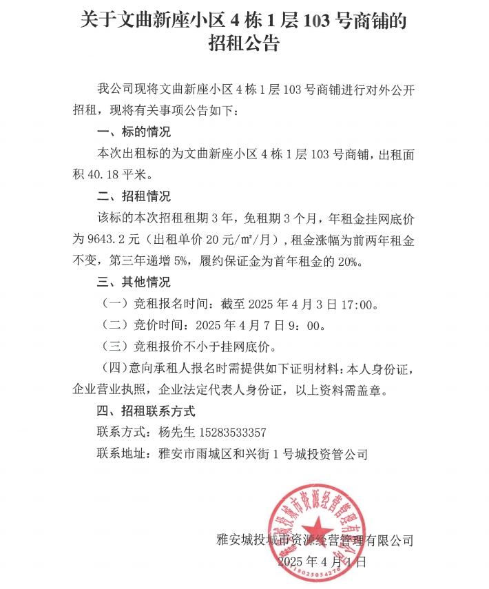 關(guān)于文曲新座小區(qū)4棟1層103號商鋪的招租公告