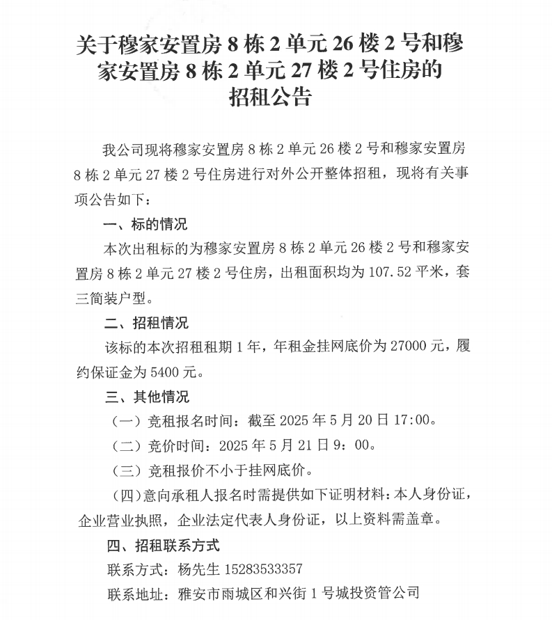 關(guān)于穆家安置房8棟2單元26樓2號(hào)和穆家安置房8棟2單元27樓2號(hào)住房的招租公告