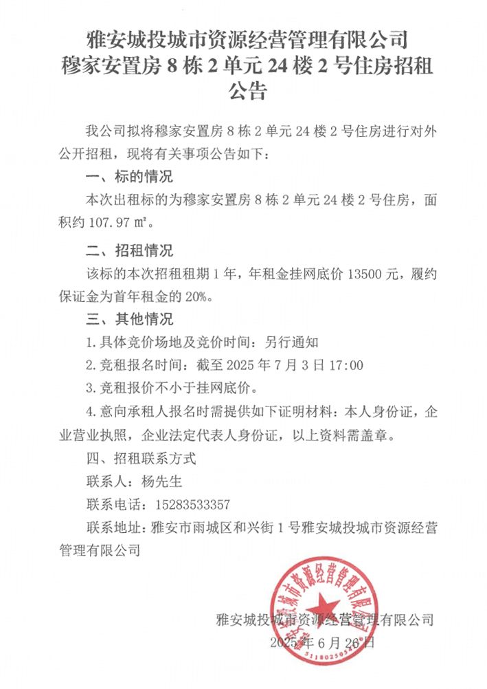 雅安城投城市資源經(jīng)營管理有限公司穆家安置房8棟2單元24樓2號(hào)住房招租公告