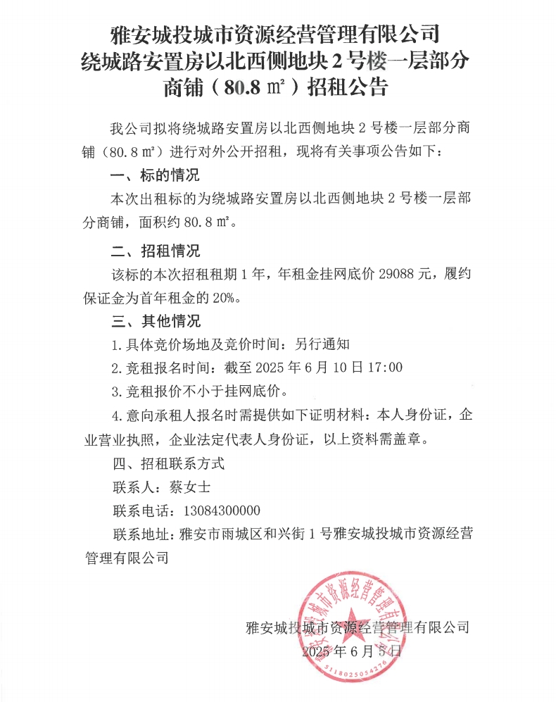 雅安城投城市資源經(jīng)營(yíng)管理有限公司繞城路安置房以北西側(cè)地塊2號(hào)樓一層部分商鋪(80.8m²)招租公告