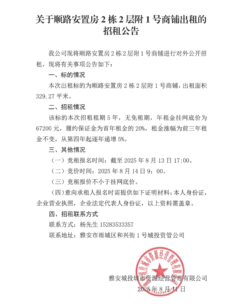關于順路安置房2棟2層附1號商鋪出租的招租公告