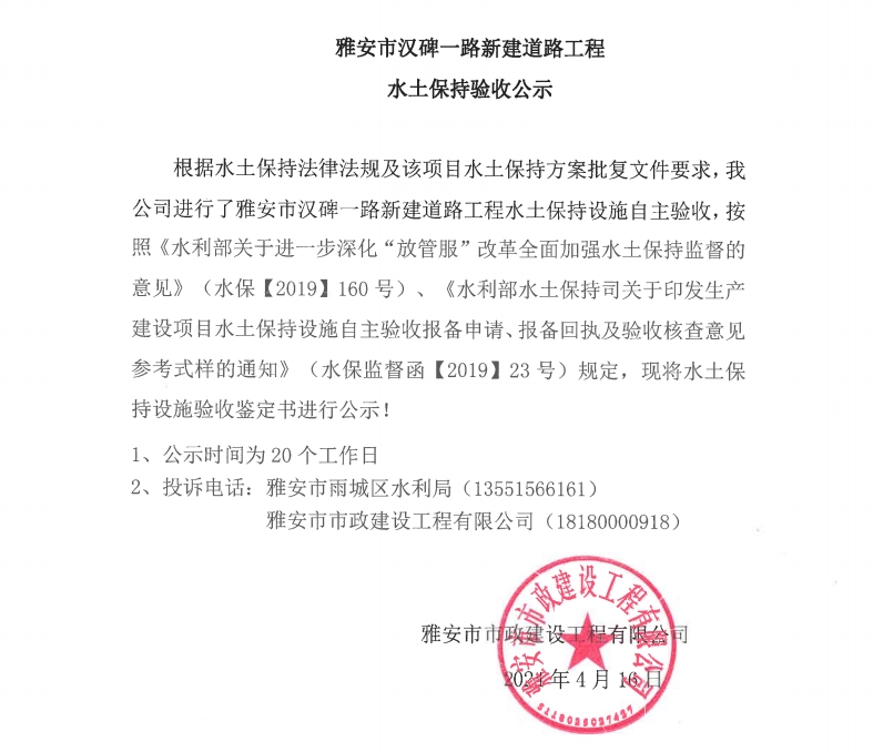 雅安市漢碑一路新建道路工程水土保持驗收公示