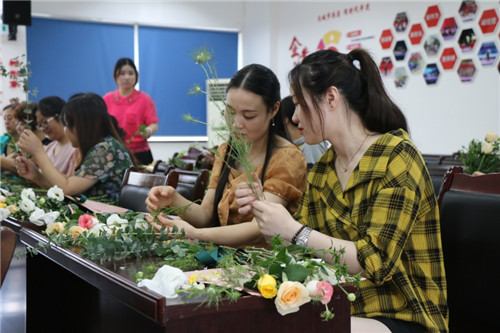 員工們緊盯花藝師邊學(xué)邊練,花枝高低錯落、疏密有致、虛實(shí)結(jié)合……,現(xiàn)場氣氛非;钴S,一個個插花技巧華麗集合。經(jīng)過2小時的精心制作,一束束鮮花逐漸形成,大家看著自己的作品,充滿了成就感和喜悅感。