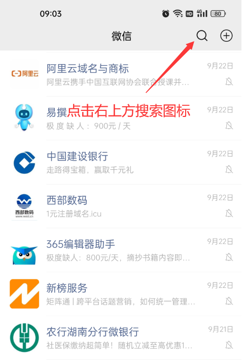1、打開手機(jī)微信,點(diǎn)擊右上方“搜索圖標(biāo)”,進(jìn)入微信搜索頁。