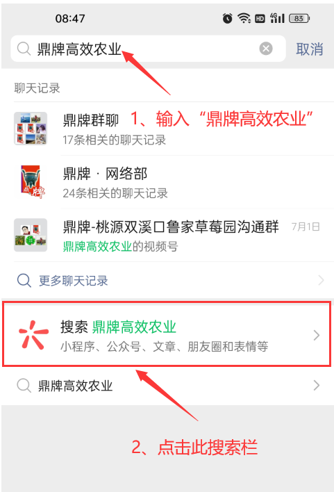 2、在輸入框輸入“鼎牌高效農(nóng)業(yè)”,下方會(huì)出現(xiàn)“搜索欄”,點(diǎn)擊搜索。