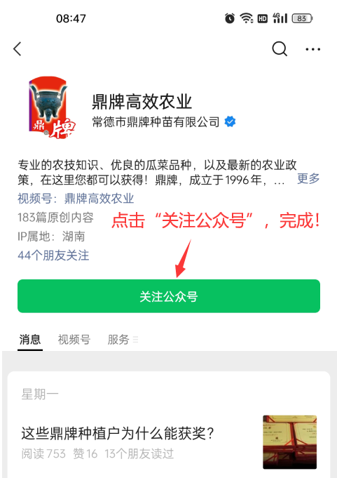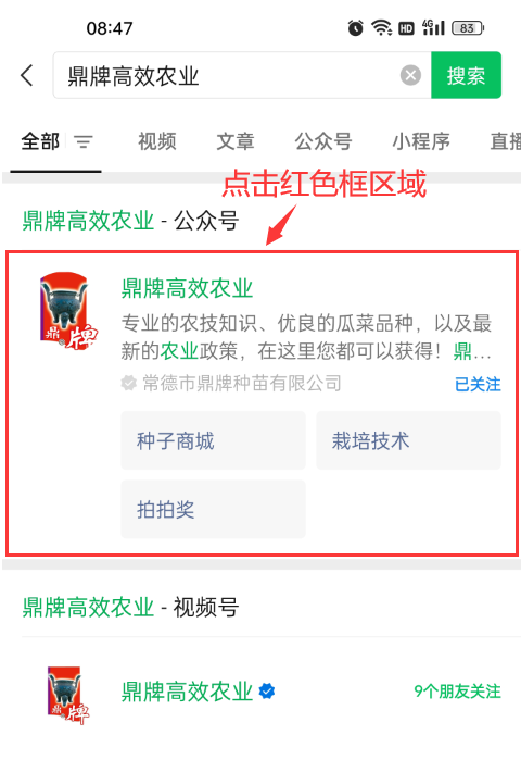 3、點(diǎn)擊紅色框區(qū)域的“鼎牌高效農(nóng)業(yè)”公眾號(hào)信息,進(jìn)入詳細(xì)頁面。
